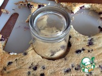 Готовый корж достаем из духовки, переворачиваем его. И с помощью стакана вырезаем кружочки для основы пироженных. |