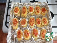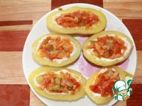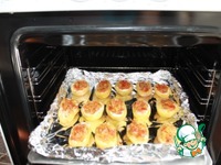 Обильно смажем соусом углубления в картофелинах. |