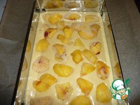Противень застелить пекарской бумагой, смазать маслом, установить рамку (18,5 х 27,5), или взять форму небольшого размера. Вылить часть теста в форму. На тесто выложить персики. |
