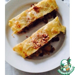 Описание: Десертный штрудель готовится из вытяжного теста с начинкой из фруктов (яблоко), ягод (клубника, вишня, брусника, малина, изюм и т. п.), творога (с ванилью), штрудель с зёрнами мака и корицей или другими компонентами. Сверху сладкий штрудель смазывают растопленным сливочным маслом посыпают сахарной пудрой. Обычно штрудель подают горячим с ванильным мороженым или взбитыми сливками и шоколадным сиропом. Штрудель прекрасно сочетается с лёгким кофе — типа латте — и чаем.