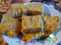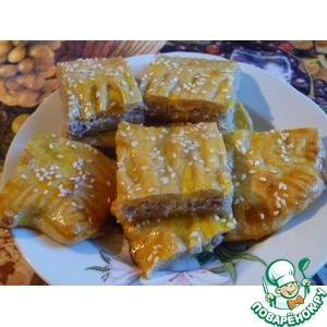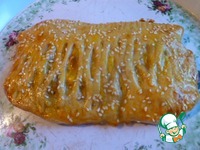 Перенесла на противень с пергаментом и обильно смазала слойку взбитым желтком с 1 ст. л. молока. В дырочки вылила остаток и посыпала сверху кунжутом. |