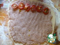 На тонко раскатанное тесто ровным слоем выложить фарш. На один край я положила кусочки помидора. |