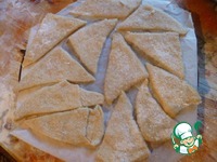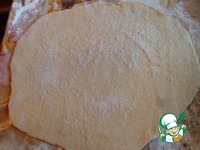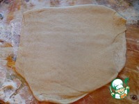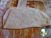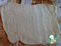 Сложить вдвое. Тонко раскатать, посыпать сахаром, сложить, раскатать. Я делала 4 слоя. Дальше тесто рвется. В последний раз раскатать. |