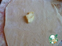 Тонко раскатать на столе с мукой. И смазываем очень мягким сливочным маслом тонко наш пласт. |