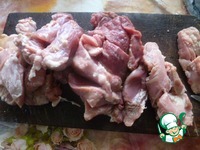 Займемся начинкой. Мясо порезать, лук очистить. |