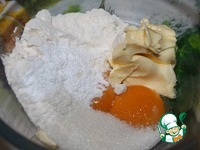 Желтки, размягченное масло, 50 г сахара, муку и разрыхлитель соединить. |