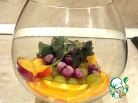 Нарезаем на кружочки 1 апельсин и ½ лимона, нарезаем на дольки 1 персик, кладем 50г вишни, 50г винограда, 2 веточки мелиссы и все кладем в кувшин. |