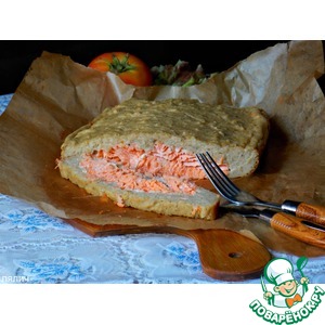 В форму положить пекарскую бумагу и смазать маслом. Положить 1/2 нашего теста прямоугольником чуть больше куска форели, которую кладем на него. |