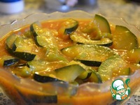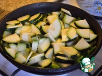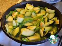 Пока тушится перец нарезаем кабачок и добавляем его к перцу. |