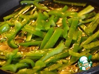 Порежем перец, положим в сковороду, добавим масло и воду, поставим тушиться. ( нарезать тонкими полосками) |