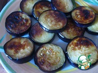 Баклажаны нарезать шайбочками, толщиной 0,5 см, посолить, через 10 мин промыть под проточной водой, осушить полотенцем, пожарить на раст. масле с одной стороны. |