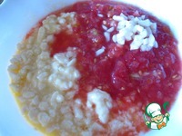 Разрезать помидор пополам, потереть на терке, отделившуюся шкурку выкинуть, слить жидкость. Мякоть помидора и измельченный ножом зубок чеснока добавить к плавленному сырку, посолить, перемешать. |