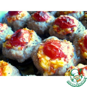 С помидорок черри срезать бочки и украсить котлетки. (С одного помидорчика можно получить 2-3 кругляшка). Завершающий штрих: сбрызнуть котлетки оливковым маслом и посыпать прованскими травами. |