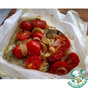 Рыба с помидорами и луком в пергаменте — кулинарный рецепт с сайта Поварёнок.ру.
