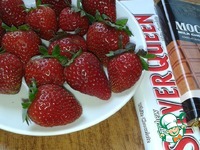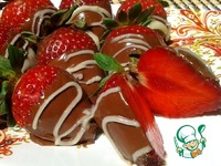 Когда шоколад станет мягким, окунаем туда клубнику наполовину и выкладываем на плоскую тарелку. К сожалению фото этого шага нет, засветилось так, что ничего не видно ( ( ( Когда вся клубника будет покрыта шоколадом (белым или молочным, на ваш вкус), можно отправить в холодильник минут на 20. Достаём из холодильника. Берем пакет, отрезаем угол сантиметров в 15. Срезаем крошечный уголок пакета, ведь нам нужна тонкая струйка. Кладём ложку растопленного шоколада в пакет и, сдавливая пакет, рисуем полоски на шоколаде. Подаем в красивом блюдце :) Такой рецепт обязательно оценят ваши дети! |