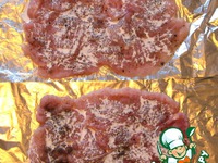 Выложить на подготовленное мясо по всей поверхности грудинку и сверху посередине шампиньоны |