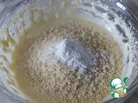 Измельченный в мелкую крошку миндаль и разрыхлитель теста. Перемешать. |