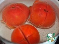 Берём помидоры, делаем крестообразные надрезы, опускаем в кипяток на 30 сек, далее в холодную воду, лучше под кран и снимаем шкурку. |