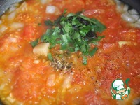 Добавляем соль, сахар, чёрный молотый перец, сушёный орегано, мелкопорубленную зелень петрушки и базилика. Перемешиваем и тушим на медленном огне 15 минут до небольшого загустения. |