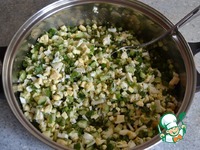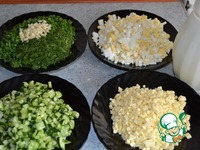 Пока процесс идет, мелкими кубиками нарезаем наши продукты. Любители терок могут их натереть, но по моему глубокому убеждению, с нарезанными получается лучше. Сваренные вкрутую яйца также измельчаем. |