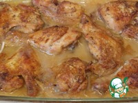 Курочку переложить в форму, посолить, поперчить, посыпать мелко резанным чесноком и мукой. Перемешать. Полить соком и водой. |