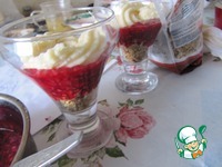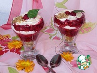 В бокалы слоями выложить мюсли, малиновый соус и сливки. |