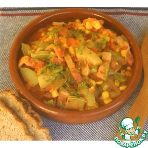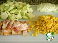 Кабачки нарезать. Очистить лук и нарезать полукольцами. Кукурузу отварить и выбрать зерна. Нарезать бекон. |