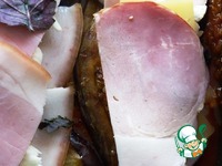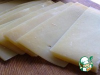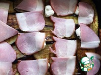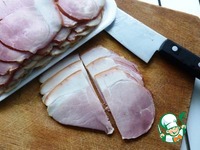 Бекон порезать на 2 части. Если будете использовать с/к бекон, его лучше порезать на 3 - 4 части поперек. Примерно так, чтобы 1 кусочек приходился на порцию. |