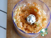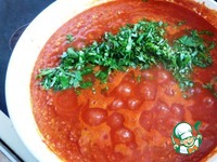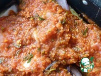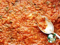 Разогреваем масло в сковороде и выкладываем измельченные овощи. Обжариваем мин 5. Добавляем чеснок и измельченную мякоть помидоров (у меня покупная). Тушим под крышкой мин 10. |