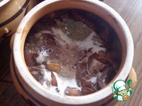 В каждый горшочек добавить 1 ст. л. сметаны, лавровый лист и налить бульон. |