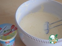 В яичную массу добавить 150 г сметаны, аккуратно перемешать лопаткой |