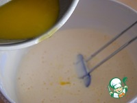Затем добавляем тёплый маргарин, перемешиваем сверху вниз лопаткой |