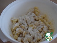 3 банана очищаем и режем на кусочки. Пересыпаем их 1,5 ст. ложки муки |