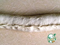 Начинайте скручивать в рулет. После одного оборота придавите пальцами тесто вдоль края рулета к пласту. |