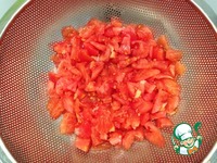 Помидоры очищаем от кожицы и нарезаем кубиками. Откидываем на дуршлаг, чтобы стёк лишний сок. Для того, чтобы легче снимать кожицу с томатов, их можно ненадолго опустить в кипяток. |