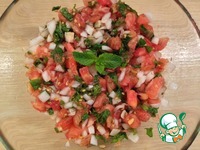 Перемешиваем помидоры, лук и мяту. Добавляем соль, сахар, перец, базилик. Перемешиваем. Можно добавить 100 гр натертого адыгейского сыра. |