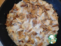 К курице отправляем грибы, солим, перчим, посыпаем мускатным орехом и жарим всё около 5 минут. |