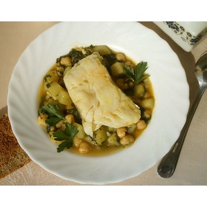 Описание: Предлагаю вам попробовать довольно необычное блюдо – треска с нутом и шпинатом. Нут прекрасно сочетается с рыбой, блюдо приготовленное на рыбном бульоне, получается очень насыщенным, но не тяжелым.