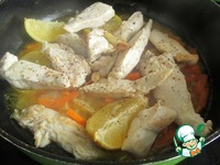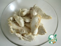 Морковь нарезать брусочками, болг. перец - тонкими полосочками, лук - кубиками. Курицу нарезать на куски. |