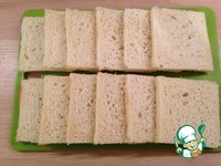 Пока варится сироп, с хлеба аккуратно срезаем корки по периметру. Должно быть чётное количество кусков. |