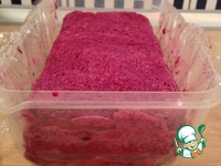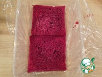 Выстилаем прямоугольную форму пищевой плёнкой и выкладываем в неё хлеб, пропитанный сиропом. Его для этого достаточно в сиропе обмакнуть с двух сторон. |
