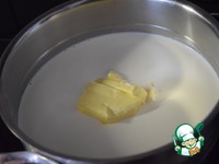 Оставшееся молоко, сливки, 100 г сахара, 60 г сливочного масла помещаем в кастрюлю и доводим до кипения. |