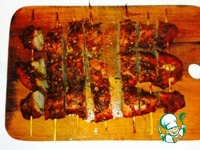 Достаем вырезку и, не снимая со шпажек, разрезаем на порции. |