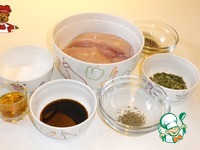 3. Залейте кусочки куриной грудки коньяком и соевым соусом, затем натрите смесью из соли со специями. |