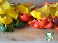4. С остывших перцев снять кожицу. Проложить форму для террина пищевой пленкой, так, чтобы края свисали, и сбрызнуть оливковым маслом. |