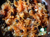 7. Добавить слой цуккини и желтого перца, тоже посыпая солью и перцем, залить соком. Выложить слой лука с изюмом, слой желтого перца и залить соком. |