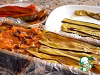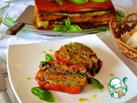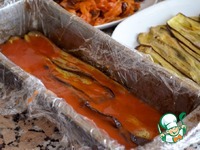 6. Выложить слой красного перца на дно террина, посыпать солью и перцем. Сверху положить слой баклажана, тоже приправить и залить все соком с желатином. |