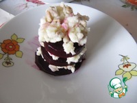 Выложить часть начинки на ломтик свеклы, накрыть вторым ломтиком, выложить на него начинку, затем еще один ломтик свеклы. Всего должно получится 3-4 слоя |
