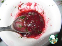 Перемешать ингредиенты для соуса: оливковое масло, сок ягод, рубленый укроп, молотый красный перец. Полить им свеклу |