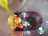 Банан нарезать небольшими кусочками, выложить в чашу блендера, добавить ягодное пюре, влить апельсиновый сок |